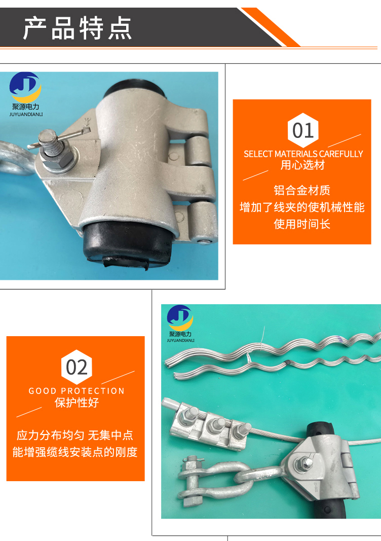 5、优质的铝合金材质,提高了线夹的机械性能及抗腐蚀能力,大大延长寿命。