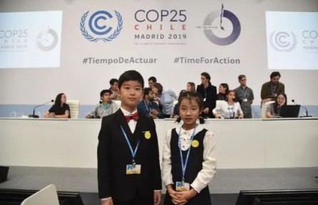 ·陈鹤途和黎子琳(右)在第25届联合国组织气候问题交流会当场。