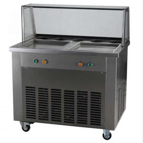 炒冰机其实就是炒酸奶机,是把水制品属于冷冻的方式,是液体变成半固体。炒冰机由压缩机、冷凝器、蒸发器、毛细管、过滤器组成,其特征是压缩机的一端与冷凝器进口端相接,另一端与蒸发器的出口端相接,冷凝器的出口端与过滤器的进口端相接,蒸发器的进口端与毛细管出口端相接,过滤器的出口端与毛细管进口端相接,蒸发器由盘管和炒锅组成,盘管是绕缠在炒锅的锅底上,在冷凝器的一侧装有强制冷凝器冷却的风机。炒冰机可以用来做炒冰、炒冰果、炒雪花膏等产品。可以做炒酸奶,冰激凌卷,可以炒鲜果酱或者果汁,都是非常美味的。炒冰的程度可以随意控制,真的是老少皆宜。