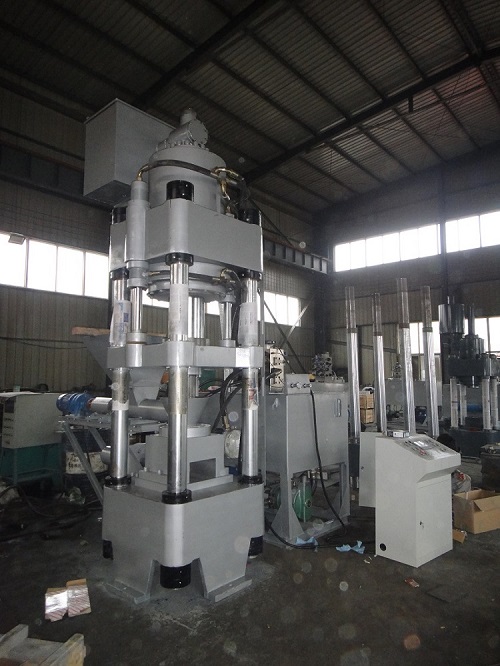 钢屑压块机的结构特征:由上下横梁、液压缸总成、加料缸、模具、料斗、充液总成等组成。上下横梁由立柱和螺母联接,主液压缸前端用法兰联接在横梁底部,模具固定在下横梁上,模套固定在模具内,冲头直接联接在油缸活塞杆顶端,模套和冲头均可拆卸和更换。有一抽板缸位于主机下模具后面,抽板缸前位时与模套形成模腔底部,后位时底部形成空间,利于饼块落下,同时具有推饼出模具底部的功能,加料缸和加料斗组成自动加料机构,机器的加料由加料缸的往复动作完成,充液系统位于横梁侧面,以补充主油缸快速前进所需的油液。