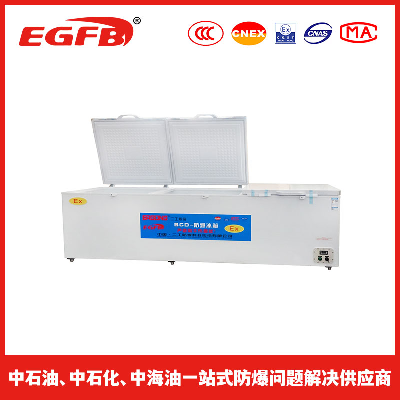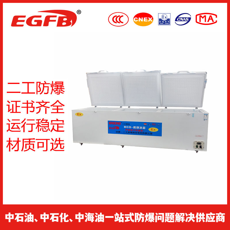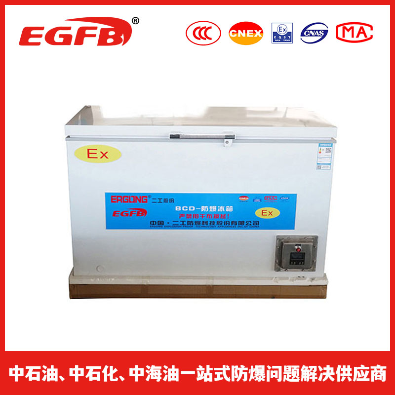 防爆冰箱具有防爆性能的一类冰箱。相关产品类型有:防爆(双门双温)冷柜,防爆(玻璃门冷藏)冷柜,防爆(超低温)冷柜,防爆(卧式)冷柜。防爆冰箱适用于II类A级、B级或C级,温度组别为T1 ~T6,含有爆炸性气体环境危险场所的0区、1区、2区;以及含有爆炸性粉尘与空气混合物的20区、21区或22区所有危险区场所。