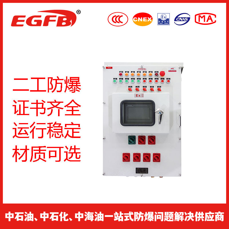 BXK防爆控制箱用途和适用范围BXK系列防爆控制箱(以下简称防爆控制箱)是按GB3836.1~2设计和制造,配电箱主要用于1区或2区中含有爆炸性混合物为Ⅱ类B级T4组及以下爆炸危险场所,适用于可燃性粉尘环境20区、21区、22区,适用于温度组别为T1—T6的环境,作为交流50Hz,额定电压至380V,线路中远距控制信号、电气等,并有信号指示灯。